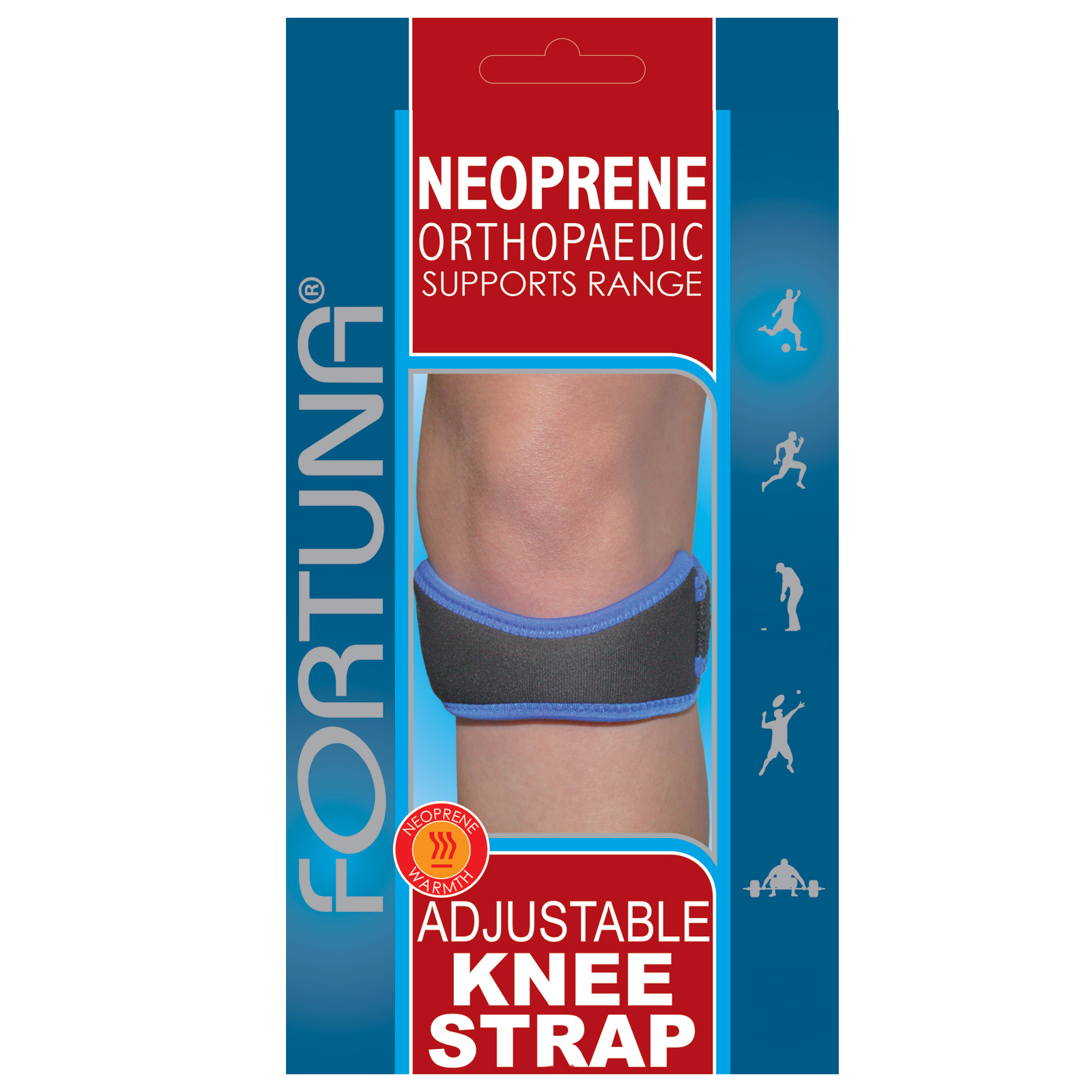 The FORTUNA Neoprene Adjustable Knee Strap is anatomically shaped for greater comfort and support.